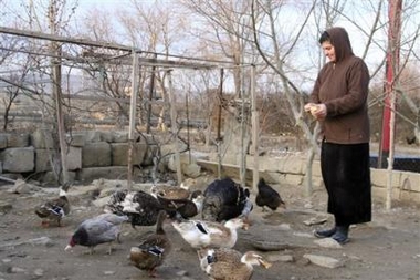 feeds her domestic birds in the village of Sahil, 35 km (22 miles) south