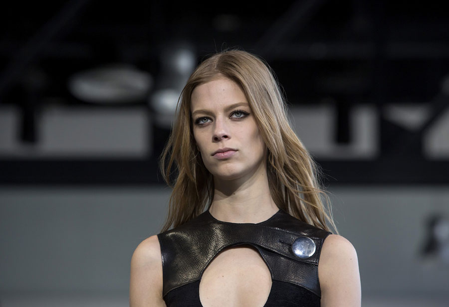 A model presents a creation from the Calvin Klein Fall/Winter 2015 collection during New York Fashion Week Feb, 19, 2015. [Photo/Agencies]