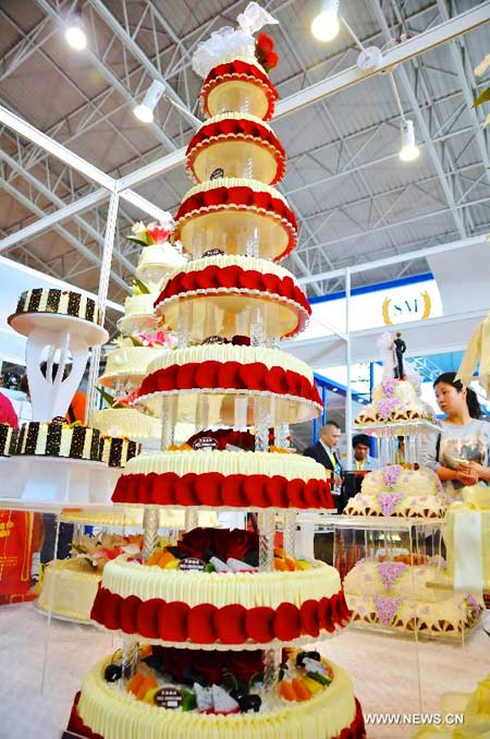 Visitors watch a tower cake model during 2014 China Beijing International Bakery, Icecream and Food Processing and Packaging Exhibition in Beijing, capital of China, April 8, 2014. The exhibition, which kicked off on April 8, will last for three days. [Photo/Xinhua]