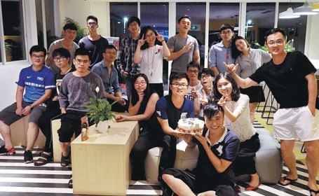 Kwok (front row) celebrates his birthday with his team and neighbors in the open lounge of a hostel that provides a platform for young talent in Qianhai.Provided To China Daily |