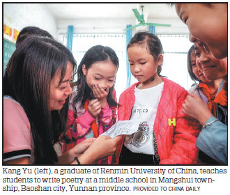 One month before her graduation, Kang, now 26, decided to move to Mangshui township, in Yunnan's Baoshan city, and work as a teacher at a middle school. In doing so, she went against the wishes of her parents, as she had already enrolled for a master's degree at the university.