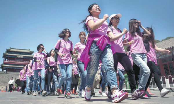 Breast cancer survivors and volunteers march to heighten public awareness of the disease. Chen Xiaowei / Xinhua |