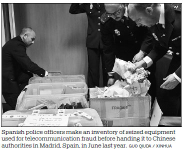 In December 2016, 800 police officers, including 100 from China, conducted joint arrests in Spain to capture the 237 suspects. The police dismantled 13 fraud centers and confiscated equipment used to conduct crimes valued at 120 million yuan ($17.34 million), he said.