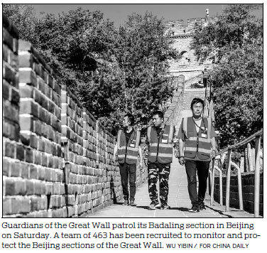 A team of 463 guardians has been recruited to monitor and help protect the Beijing section of the Great Wall, the city's cultural heritage authority said on Saturday.
