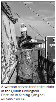 The pasture quickly became a popular holiday resort featuring tent hotels, restaurants, yak farms and workshops that allow visitors to make local specialties such as yogurt and guokui, a round cake that is popular across Northwest China.