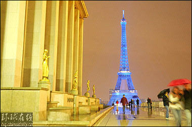 法国庆祝“欧洲日” 埃菲尔铁塔发出璀璨蓝光