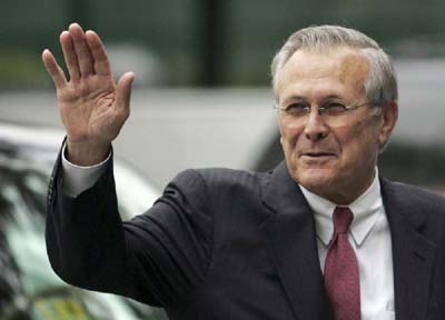 同大多数鹰派人物一样,拉姆斯菲尔德习惯于高高在上指挥一切,对布什也有着无与伦比的影响力,布什对他不算是言听计从,也算是青睐有加。有一件事颇能说明他跟布什之间非同寻常的关系:一次周末,布什和他的主要助手到戴维营度假,晚上在那里舒适的电影小厅中看电影,拉姆斯菲尔德恰巧和布什坐在一起。让布什的年轻助手们颇为吃惊的是,电影放映到一半的时候,拉姆斯菲尔德径自站了起来,走到自己的办公室里处理文件去了。在华盛顿只有“真正最自信的人”才会在总统面前这么做。