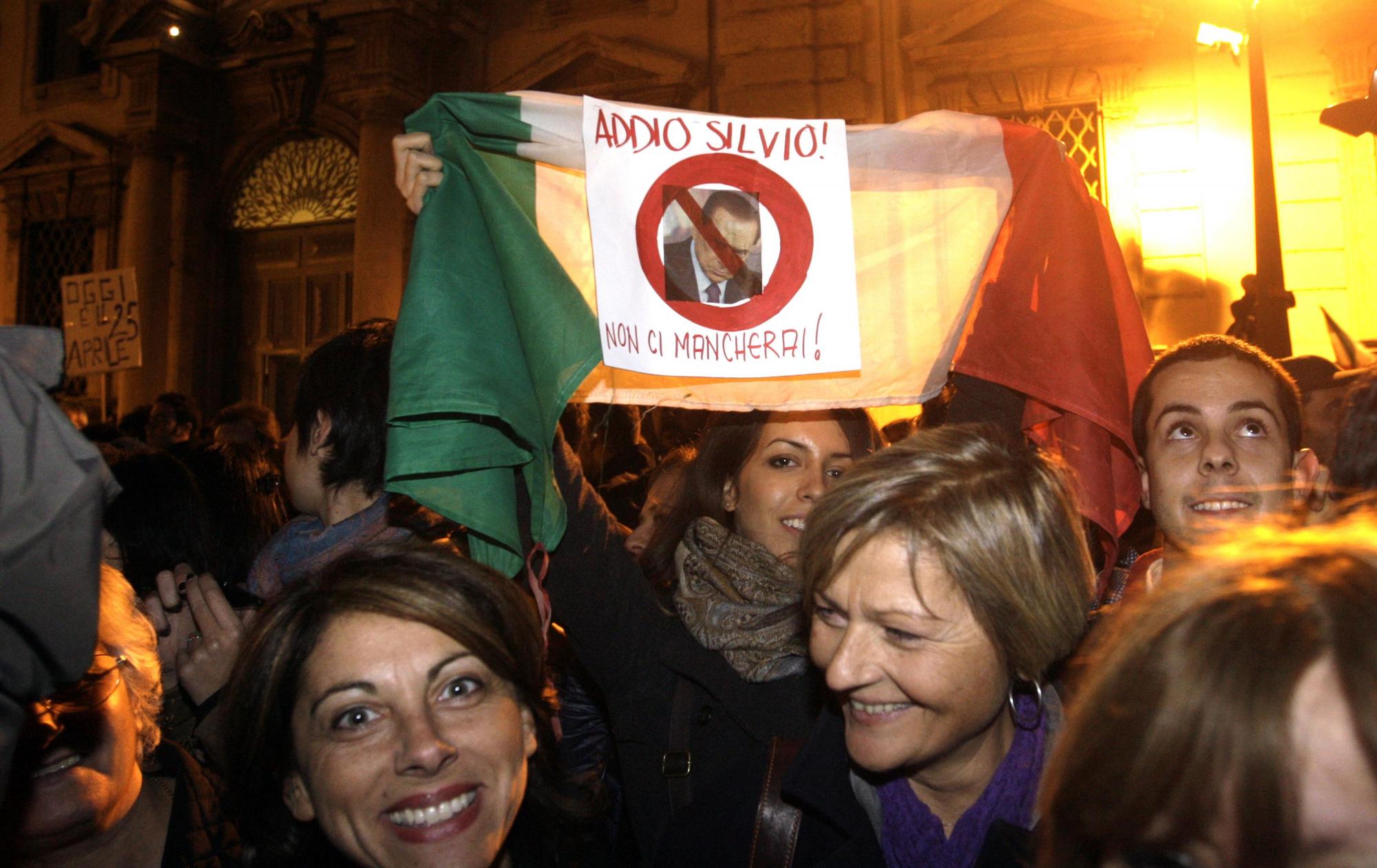 11月12日,大批民众在意大利总统官邸前庆祝贝卢斯科尼辞职。