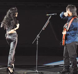 莫文蔚(左)又对伍佰做了一次拉开上衣动作,伍佰害羞不敢看,手势却像在擦口水。(图片来源:台湾《中国时报》)