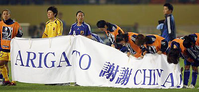 我不可遏止地想起这两句话,源于“九一八”前一天,在杭州举行的2007女足世界杯上,德国女足得到了主场般的待遇,而其对手日本女足却受尽了在场中国球迷的冷遇甚至还遭到了嘘声。然而,出乎意料的是,在比赛结束后,日本女足队员仍然向现场球迷拉出了写有中、英、日三国文字的“谢谢中国”的横幅,并深鞠一躬。