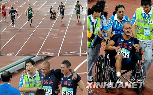 9月9日,在“鸟巢”举行的男子100米T44级比赛中,美国运动员马龙·雪利突然摔倒。在其他选手全都冲过终点后,他忍痛走向终点,最终以34秒43的成绩获得第八名,赛场上响起最热烈的掌声。医护人员冲上场用轮椅把这位“真心英雄”推下场医治。新华社记者陶明摄