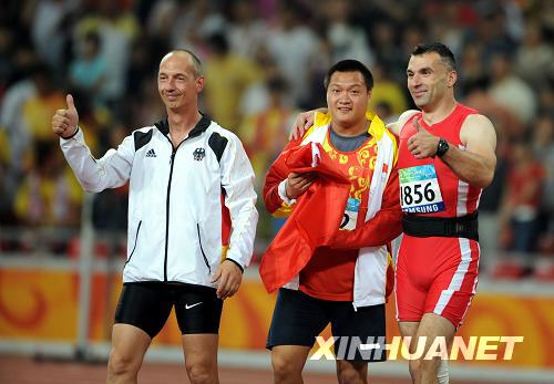 9月13日,中国选手夏东(中)获得男子铅球F37/38级决赛冠军并以16米60的成绩打破该项目世界纪录后,对手竖起大拇指。新华社记者张瑞琪摄