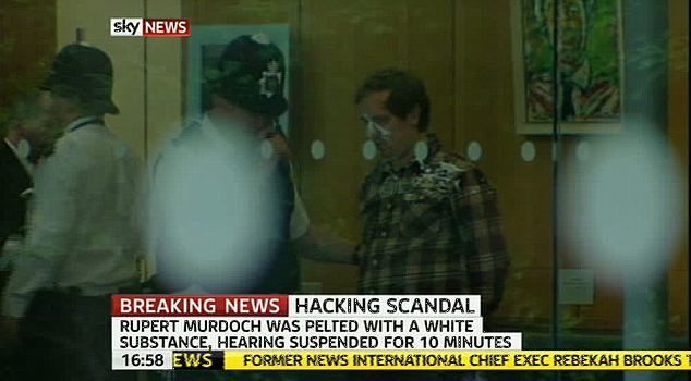 北京时间7月19日凌晨,在英国议会就《世界新闻报》窃听丑闻质询默多克父子时,一名男子突然从听众席窜起,手拿餐盘,跨过默多克旁边的人对其袭击,身后妻子邓文迪迅速跃起,第一时间抬手准备给袭击者一巴掌。袭击者随后被警方带走。