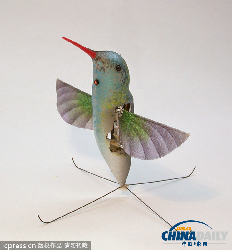 酷似蜂鸟的无人间谍侦察机。据媒体报道,美国五角大楼历时5年,耗资400万美元,最新研制出一款状如蜂鸟般大小的无人间谍侦察机。它不需要推进器,却能像鸟儿一样通过扇动小小的翅膀获得动力,自由自在翻飞。虽然它的时速可达11英里(约18公里),续航时间长达8分钟,但是其翼展仅为16厘米,重量还赶不上一只5号电池。