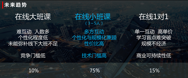 在杨正大看来,在线小班课(3-5人)才是最佳的教学形态。一方面,它保证了师生、生生间的高频互动,能够满足学生的个性化学习需求,拥有不亚于甚至超过一对一的学习效果;另一方面,它的运营成本相较一对一更低,拥有巨大的获利空间。学习效果与商业可持续性兼顾,个性化与规模化兼得,在线小班课将成为在线教育的主流产品。
