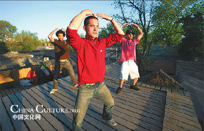Alex Tan (center), Paul Lara (right) and another expat practice tai chi at the roof of The Hutong. Photos by Jiang Dong |