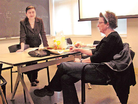 Deng Yan, an instructor for New School University's On the Go series of intensive weekend courses, in discussion with one of her students Diane Mitchell.[Photo/China Daily] |