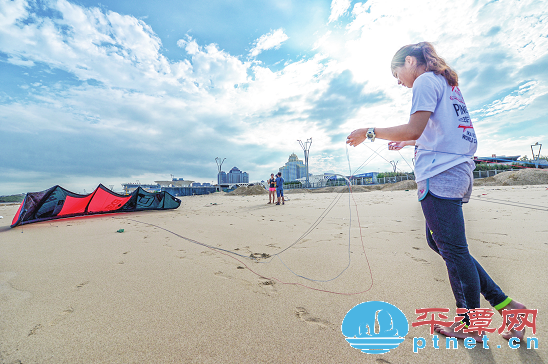 Pingtan kitesurfer Chen Jingle arranges the strings of her kite during a training session on Sept 18. [Photo by Cai Qihui/Pingtan Times] |