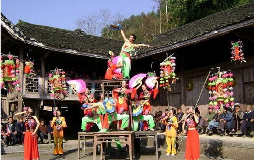 Its major folk arts are the flower-drum opera, the phoenix lamp dance, the local folk song , Quju opera, Henan opera, Er Peng Zi opera, and gong and drum beating. These are all characteristic of Hubei, Henan, Shaanxi and Sichuan provinces, showing both royal demeanor and primitive features. The musical instruments are xiao, gong, drum, suona, erhu, bamboo flute, bo and small cymbals. Such instruments are representative of local dramas, Er Gan Zi Recruitment (to the tune of Er Peng Zi), Hongjiang Torrents (to the tune of Yunyang Flower Drums), Sleeping Tiger Worships Phoenix (Henan Opera), Zhang Fei Meeting the Wise at Juanxi Cave, and Stubborn Ox in Deep Mountains (modern Henan Opera).