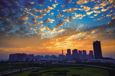 Scattered clouds float high above the city, painted with the vivid colors of the afternoon sun. [Photo by Han Liesheng] |