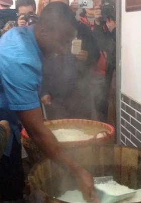 A foreign guest experiences one of the unique techniques in Yuqi Distillery’s liquor making process. [Photo by Liu Sitong/China Daily]