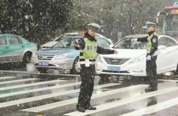 Traffic police redirect cars during the snowfall on Jan 4. [Photo provided to chinadaily.com.cn] |