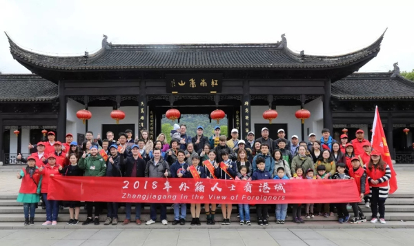 Foreign guests with their Chinese guides pose for a photograph during a specially organized tour of Zhangjiagang, Jiangsu province, April 14.[Photo provided to chinadaily.com.cn] |