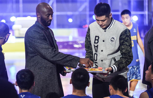 Kobe (left), and He Tianju (right), a basketball player from China’s Liaoning Basketball Team, meet fans in Shenyang. [Photo/Xinhua] |