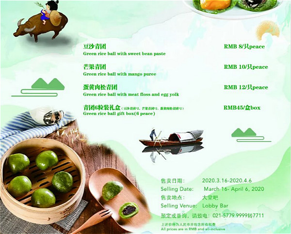 Three flavors of qingtuan, a seasonal delicacy eaten during the Qingming Festival, are currently on sale at Yuluxe Sheshan, a Tribute Portfolio Hotel at the Shanghai Sheshan National Tourist Resort, from March 16 to April 6.