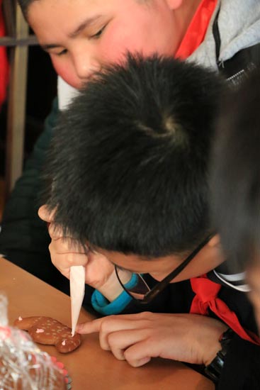 A boy is absorbed in making a ginger cookie. [Photo provided to chinadaily.com.cn] |