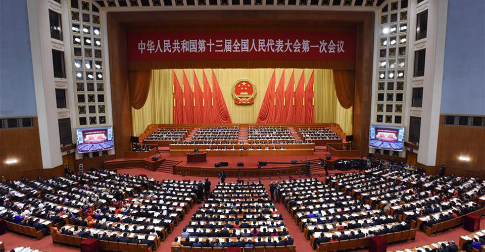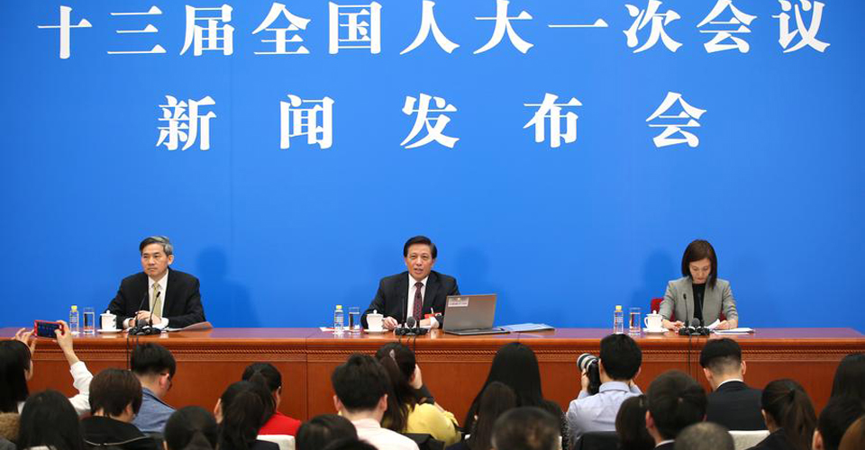 Zhang Yesui (C), spokesperson for the first session of the 13th National People's Congress (NPC), speaks during a press conference on the NPC session at the Great Hall of the People in Beijing, capital of China, March 4, 2018. The first session of the 13th NPC will open in Beijing on March 5.