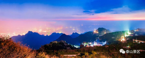 When darkness falls, Mount Tai looks welcoming with flickering and colorful lights. [Photo by Qu Yezhi/WeChat account: hitaishan] |