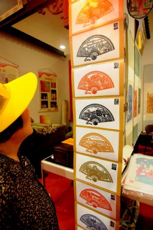 | A visitor admires Chinese traditional handicraft "paper cut" during the 1st China National Intangible Cultural Heritage Exhibition in Hangzhou, east China's Zhejiang Province, Sept. 17, 2009. The exhibition, which opened on Thursday, attracted nearly 600 items of intangible cultural heritage at provicinal level. (Xinhua/Zhu Yinwei) |