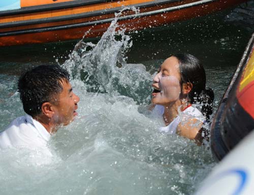 Yin Jian of China (R) celebrates her gold medal with her coach in the water after the RS:X women's class competition at the 2008 Beijing Olympic Games on August 20, 2008 at the Olympic Sailing Center in Qingdao. Alessandra Sensini of Italy took silver and Bryony Shaw of Britain claimed bronze. [Agencies]