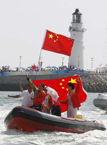 Yin Jian of China (front) waves Chinese national flag as she celebrates her gold medal victory in the RS:X women's class at the 2008 Beijing Olympic Games on August 20, 2008 at the Olympic sailing center in Qingdao. Alessandra Sensini of Italy took silver and Bryony Shaw of Britain claimed bronze. [Agencies]