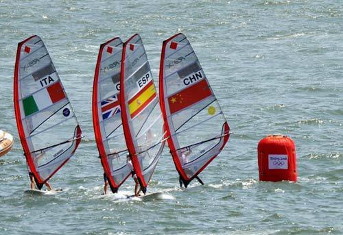 Competators sail round a mark during the RS:X women's class at the 2008 Beijing Olympic Games on August 20, 2008 at the Olympic Sailing Center in Qingdao. Yin Jian of China won gold. Alessandra Sensini of Italy took silver and Bryony Shaw of Britain claimed bronze. [Xinhua]