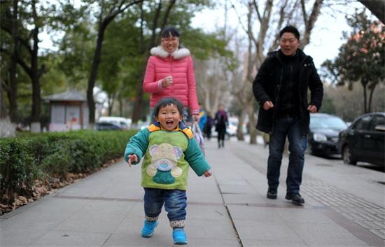 A child plays with his parents in the garden in Hunan province. [Photo/IC]