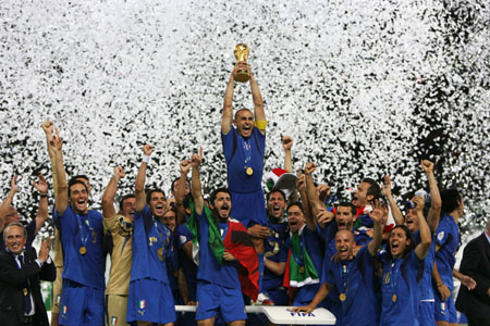 Italy's Fabio Cannavaro (C) lifts the World Cup Trophy as he celebrates with team mates after the World Cup 2006 final soccer match between Italy and France in Berlin July 9, 2006. [Reuters]