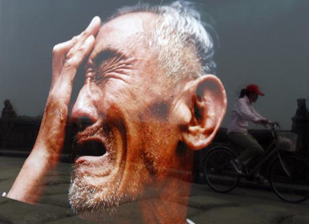 A cyclist is reflected on a photograph of war survivior Yu Huishui which is on display at Marco Polo Bridge on the outskirts of Beijing July 6, 2007, on the eve of 70th anniversary of Japan's full-scale invasion of China. The exhibit coincides with the 70th anniversary of the July 7, 1937 skirmish at the Marco Polo Bridge near Beijing, which sparked an all-out war between China and Japan.[Reuters]