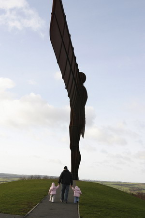 A man walks with two children towards The Angel of the North statue in Newcastle, northern England, January 19, 2008. [Agencies]