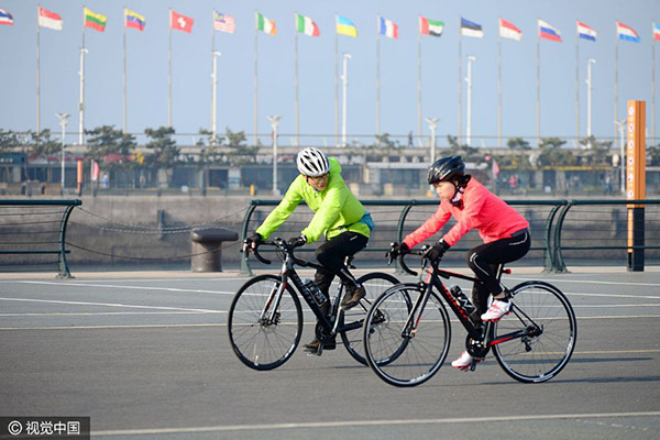 People ride bikes at the Olympic Sailing Center in Qingdao, East China's Shandong province. [Photo/VCG]