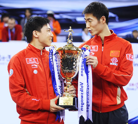 Gold medalists Wang Liqin (R) and Chen Qi chat on the podium after winning the men's doubles title of the year-ending ITTF ProTour Finals, also the last "Good Luck Beijing" Olympic test event this year December 16, 2007. Wang and Chen beat compatriots Wang Hao and Ma Lin in the final game. [Xinhua]