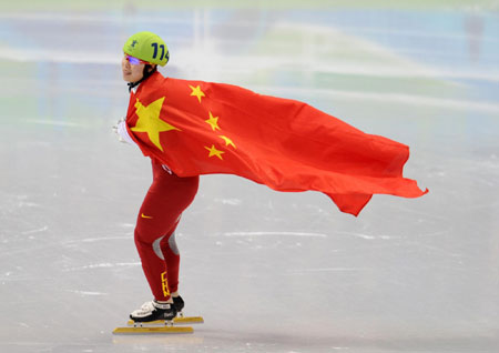 China's Zhou Yang holds a national flag as she celebrates her gold medal in the women's 1500 metres short track speed skating final during the Vancouver 2010 Winter Olympics, February 20, 2010. [Xinhua]