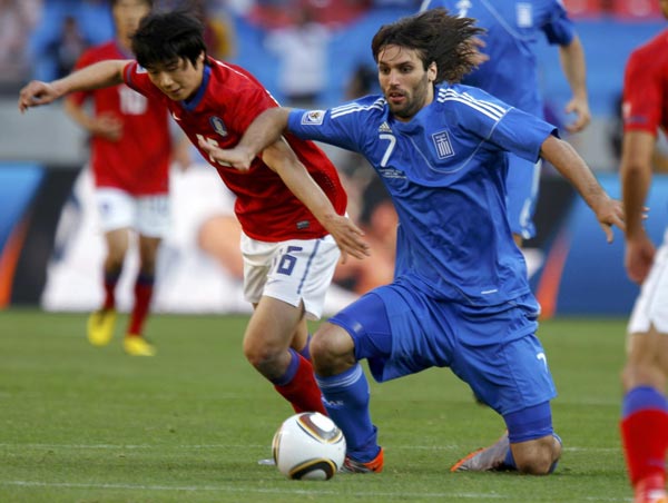 South Korea's Ki Sung-yong (L) and Greece's Giorgos Samaras battle for the ball during the 2010 World Cup Group B soccer match at the Nelson Mandela Bay stadium in Port Elizabeth June 12, 2010. [Agencies]