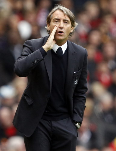 Manchester City's manager Roberto Mancini instructs his team during their English Premier League soccer match against Manchester United at Old Trafford in Manchester, northern England, Oct 23, 2011. [Photo/Agencies]