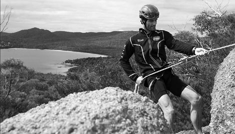 Red Bull Formula One driver Mark Webber of Australia abseils down a rock on the Mount Amos Trail ahead of the Mark Webber Tasmania Challenge in Freycinet National Park on Monday. [Photo/Agencies] |
