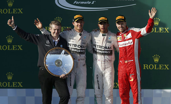 (L to R) Mercedes-Benz head of development Thomas Weber, second placed Mercedes Formula One driver Nico Rosberg of Germany, race winner Mercedes Formula One driver Lewis Hamilton of Britain and third placed Ferrari Formula One driver Sebastian Vettel of Germany pose on the podium after the Australian F1 Grand Prix at the Albert Park circuit in Melbourne March 15, 2015.[Photo/Agencies]