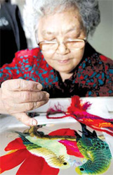 Although Yue embroidery is smooth, Yue crafters sometimes use gold and silver thread to create a three dimensional impression in their designs. The craft has also borrowed stylistic elements from other Chinese embroidery styles.