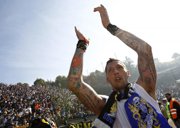 国际米兰队马特拉齐在赛后庆祝。图片来源:路透