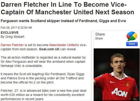 Goal.com.UK截屏:弗莱彻下赛季升任曼联副队长